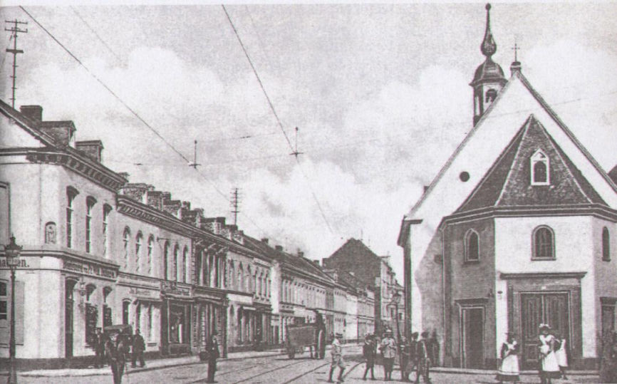Foto der Kalker Hauptstraße um 1905. Rechts die Kalker Kapelle, links die