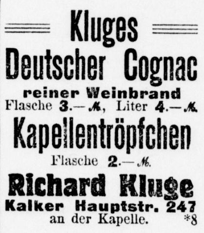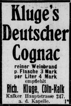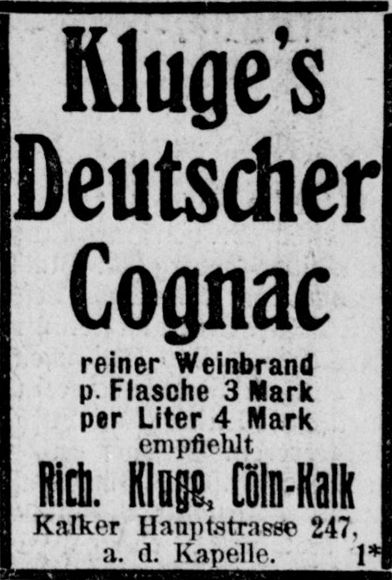 Cognac aus Köln? Richard Kluge macht es möglich, die Flasche zu 3 Mark.