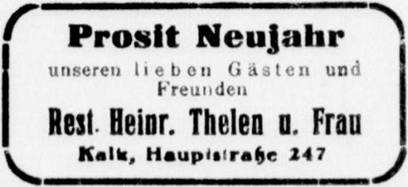 In Köln gab es eine Familie Thelen, die Brauereien, Mälzereien und Hotels betrieb. Ob Heinrich Thelen, welcher die Restauration in der Kalker Hauptstraße ab dem Jahr 1918 führte, aus dieser Familie stammte, ist unklar