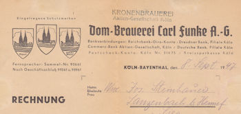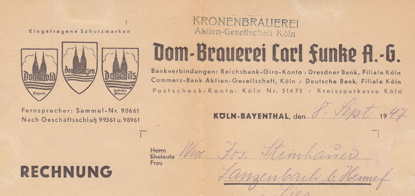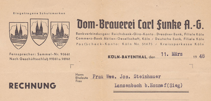 Briefkopf der Dom-Brauerei Carl Funke AG aus dem Jahr 1948. Eigentlich ist die Rechnung ja von der Kronenbrauerei, scheinbar ist die Kronenbrauerei ab 1948 aber nicht mehr separat existent. Es handelt sich inhaltlich um die gleiche Sache wie