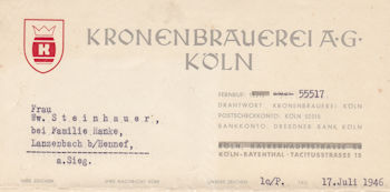 Briefkopf der Kronenbrauerei AG Köln aus von Dezember 1946.