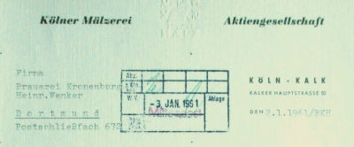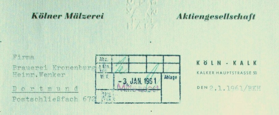 Briefkopf der Kölner Mälzerei Aktiengesellschaft aus dem Jahr 1961. Die