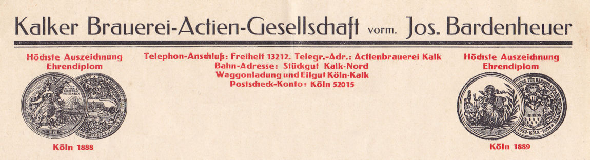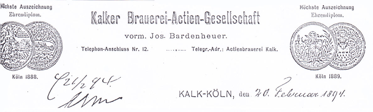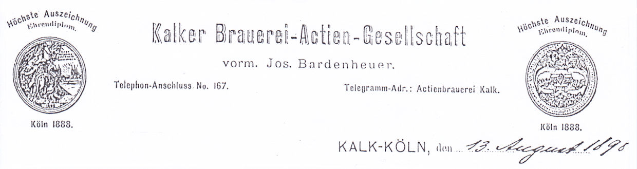Am 25.10.1888 (mit Wirkung ab 1.10.1887) wurde die Brauerei in eine Aktiengesellschaft, die "Kalker Brauerei-Aktiengesellschaft vorm. Jos. Bardenheuer" umgewandelt. Das Aktienkapital betrug 1.350.000 Mark in 1.350 Aktien zu 1.000 Mark.