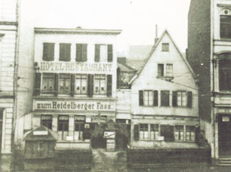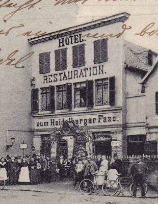 für Rheinreisende aus dem Jahr 1844 auf das nahe am Rheinufer gelegene Gasthaus "Heidelberger Faß" hingewiesen.
