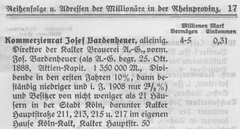 [3] wird der Kommerzienrat Josef Bardenheuer mit einem Vermögen von 4-5 Millionen Mark und einem jährlichen Einkommen von 310.000 Mark geführt. Weiter als „…Besitzer von nicht weniger als 21 Häusern in der Stadt Köln…“.