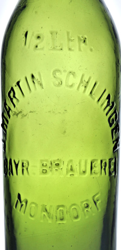 "1/2 Ltr.", darunter Bogen: "J.MARTIN SCHLIMGEN", gerade: "BAYR.-BRAUEREI", Bogen unten: "MONDORF"