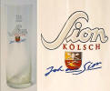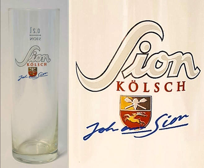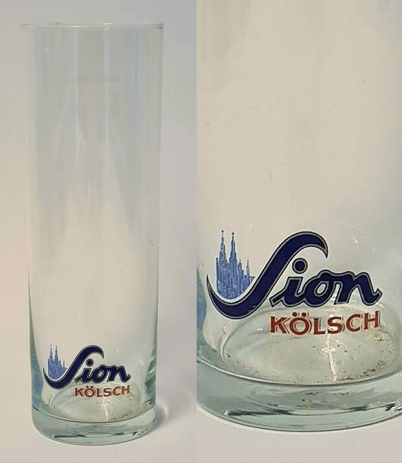 "rein obergärig" in blau, "Kölsch" in weiß ohne blaue Umrandung, Glas
